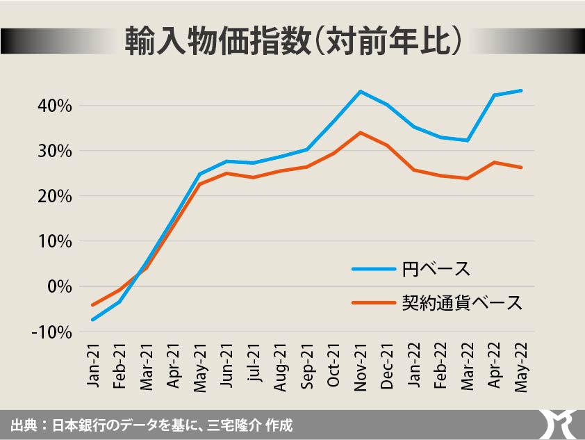 だからコロナ禍やウクライナ危機を受けて世界的にエネルギーや食糧価格が高騰したことで日本の輸入物価が一気に上昇したわけです。